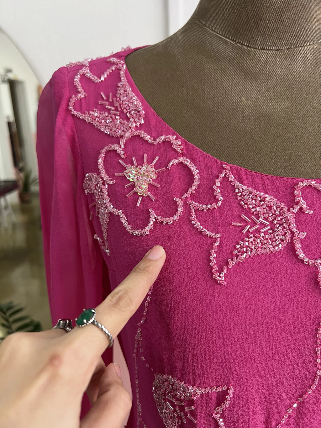 Feito em seda 100%, forrado e bordado, com modelagem longa. Peça usada, em ótimo estado.